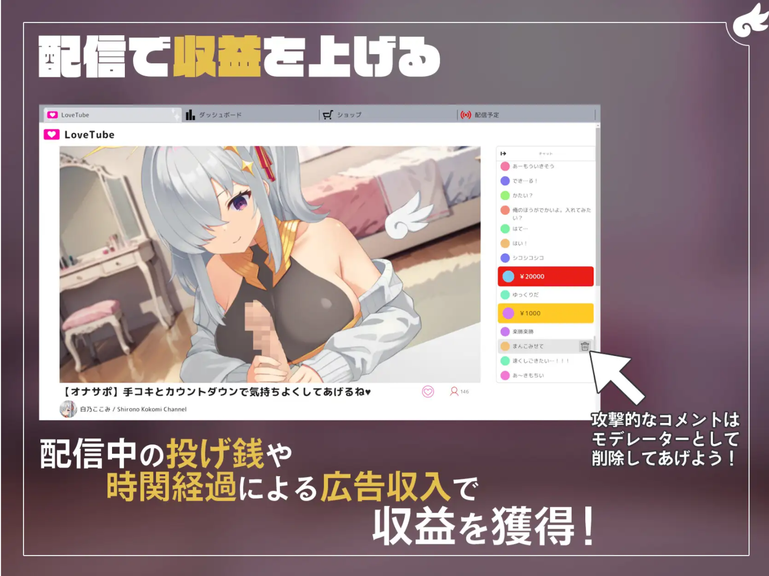 是用Live2D滑溜溜地移动的模拟游戏。作为Vstreamer·白乃这里的配信模拟器支持她的配信,提高收益,更加过激的配信。