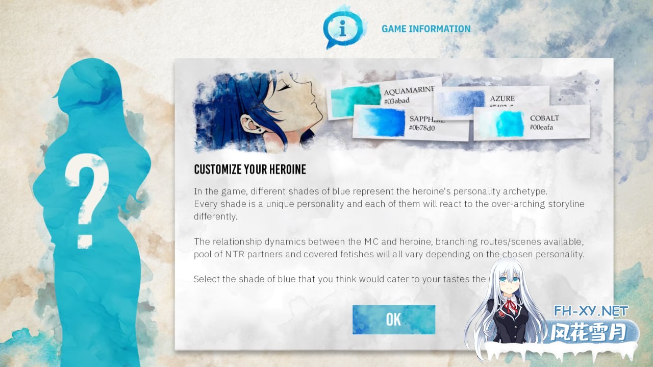《蓝之痕》是一款探索”寝取らせ”癖好多元维度的情色视觉小说。根据您选择的性格塑造女主角的命运轨迹,从五种独具特色的蓝色人格中邂逅专属故事:既有海蓝宝石般温柔奉献的色调,亦有钴蓝色那般鲜活强势的色彩。